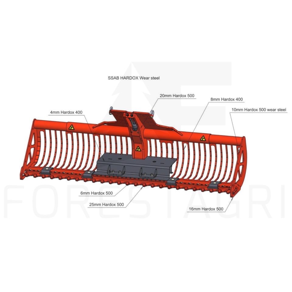 Ostrza łyżki do cięcia wykonane są z wytrzymałej i odpornej na zużycie stali Hardox. Urządzenie ma wiele zastosowań, w tym czyszczenie rowów, plaży, tam oraz inne drogi wodne. Może również być używany do łatwego oczyszczania i zbierania gąszczu i krzaków.