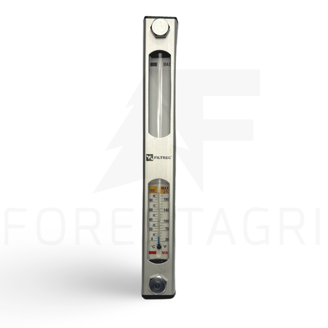 Wskaźnik poziomu oleju hydraulicznego z wbudowanym termometrem to niezbędny element wyposażenia maszyn leśnych, montowany bezpośrednio na zbiorniku hydraulicznym. Umożliwia on jednoczesną kontrolę poziomu oleju oraz monitorowanie temperatury, co jest kluczowe dla prawidłowego funkcjonowania układów hydraulicznych.